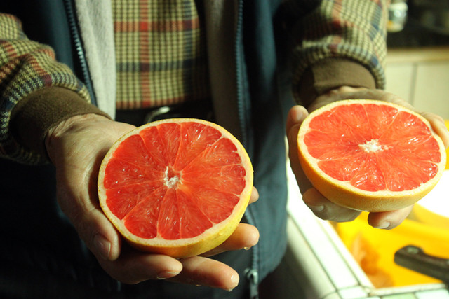 電話中靦腆地語調與本人不謀而合。站在門口等待我們出現,一眼就認出我來。立即耀入視野的是斗大的葡萄柚(一度還以為是有名的茂谷柑)。主人客氣地切對半,那沉甸甸紮實果肉與濃郁飽滿的香氣,對切呈現的是鮮豔欲滴的桃紅肉色。龍太太為了讓我們品嚐方便,八塊的細分後,在場所有人均詫異萬分。無論是水果的飽滿、風味的香醇,均是我從未品嚐過的。