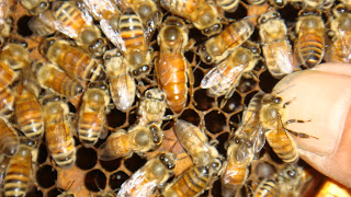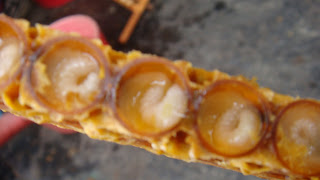 這是蜂王產的卵,幼蟲裡面就是工蜂咀嚼蜂蜜及花粉經過唾液分解的液體,就是我們熟知的蜂王漿。這也是蜂王的唯一食物。根據研究,蜂王的壽命是工蜂的40倍(前者約3~5年,後者約45~60天),研究指出跟蜂王漿的成份有很大關係,相信這也是蜂王漿價格不斐的原因。