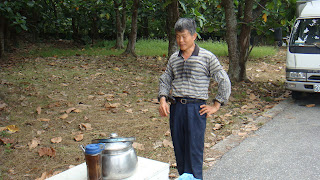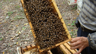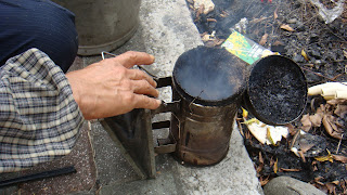 此行的目的就是要參觀養蜂場。到場的第一件事情先用炭火(其實那也不算木炭,是一種用木削擠壓成形的條狀物)引燃,透過煙來燻蜜蜂(因為蜜蜂也怕煙燻,這樣會讓牠的情緒比較安定)