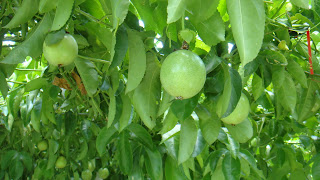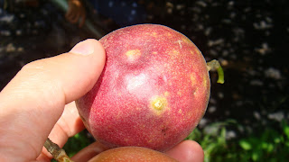 可能很多人跟我一樣,百香果是不需要採收的,而是當果實成熟以後,它會直接掉落到地面上,所以果農只要撿拾地上的百香果即可。上圖樹上的百香果果實呈現鮮綠色,非常飽滿;下圖我手上拿的,就是樹上成熟掉到地上成熟的果實,從外觀與顏色均很好分辨。