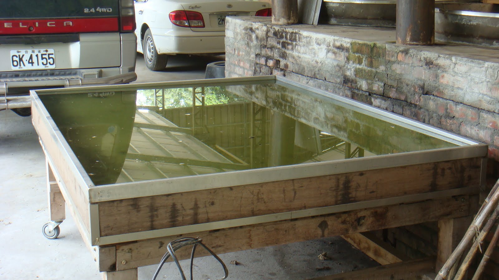 這是煮成黑糖漿後,倒入一邊鏟一邊冷卻結晶的大型平底盤。此刻是它休息的時候,有一些水浸泡其中。