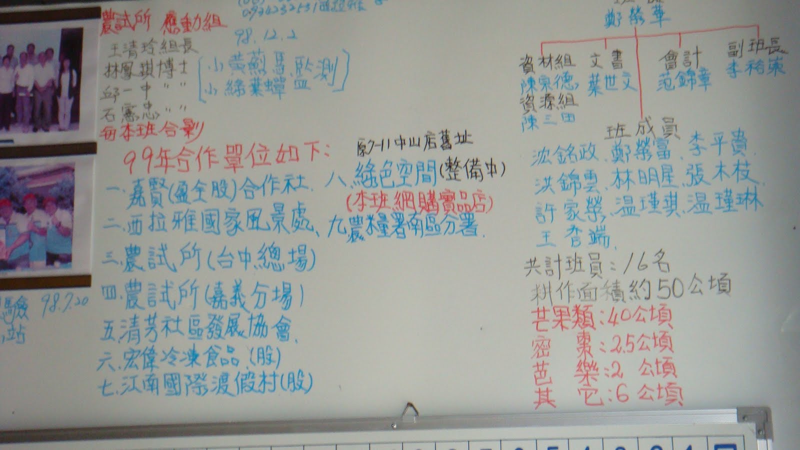 跟鄭班長聊了很多,也參觀了該產銷班的果園,發現許多我們不容易見到的果園生態都出現了!工具間標示、農具歸位、特別加蓋廁所、 芒果園區分區管理等,讓我大開眼界。以往我們都只認為這些ISO、HACCP等管制,只用在一般的公司的管理,現在這個產銷班已經落實到水果的種植了,不得讓我欽佩他們的用心。